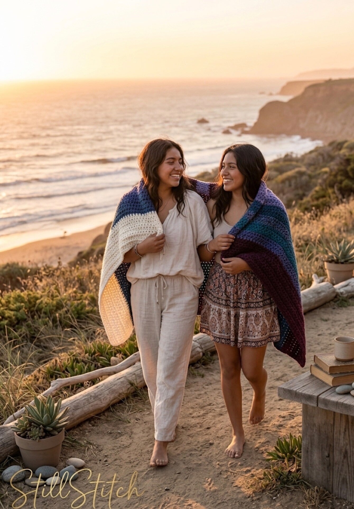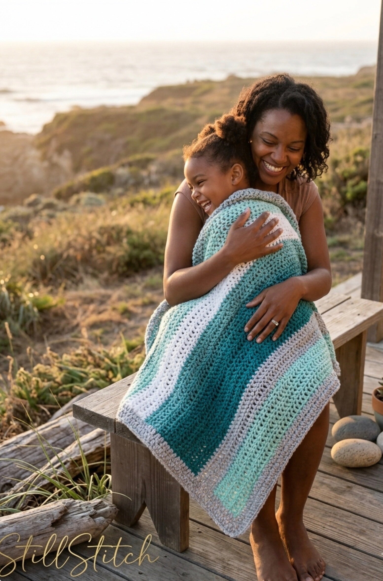 SharedStillness is a special edition of our StillMoments collection, focusing on handcrafted lap blankets perfect for shared family moments and slow living. Each piece showcases boutique crochet apparel made with a serene coastal color palette of teal, cream, and seafoam.